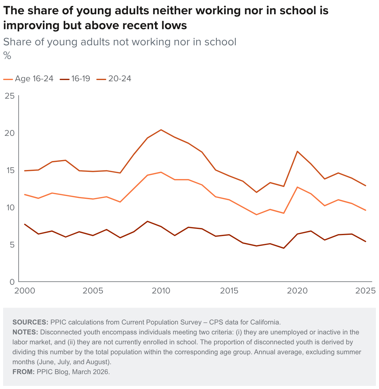 Share of young adults not working nor in school %