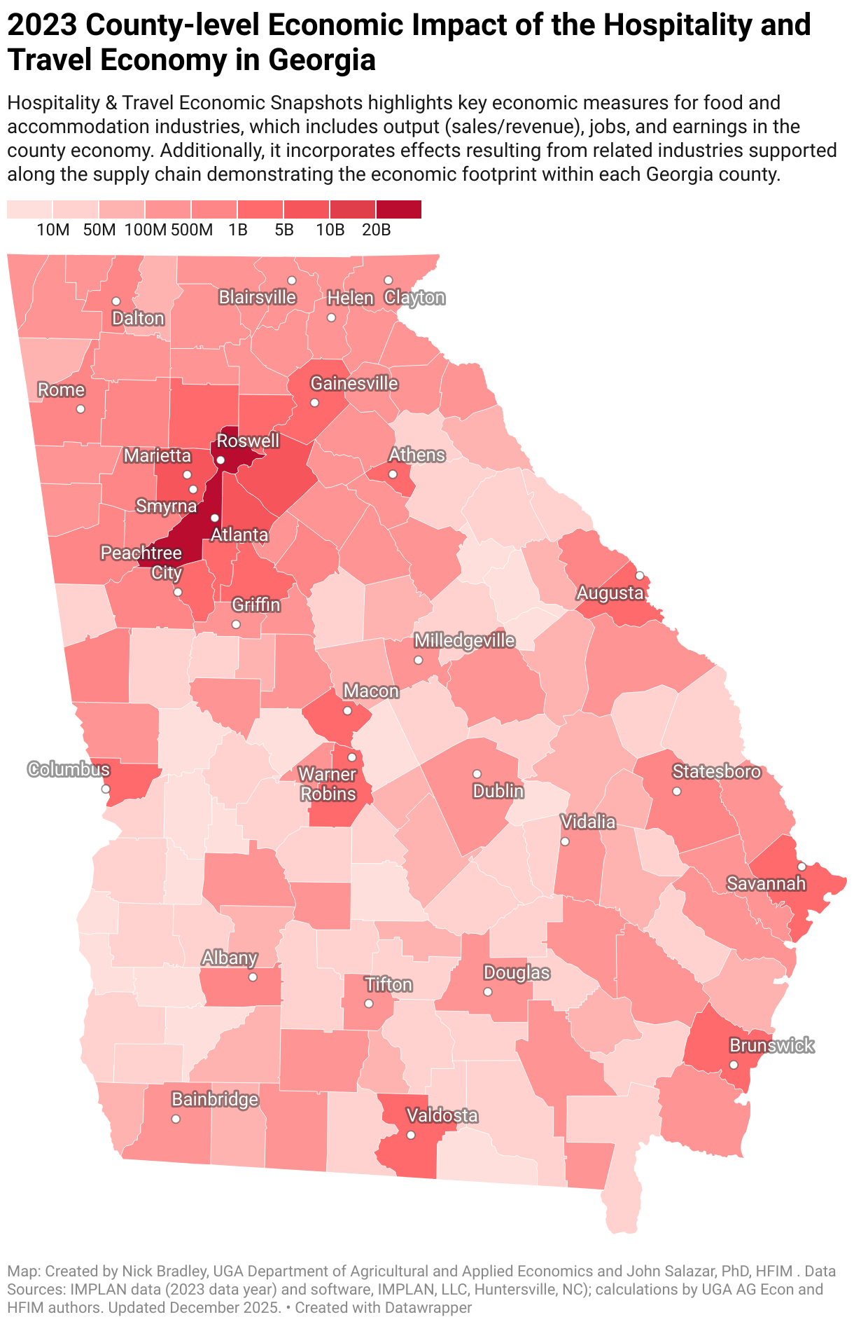 Hospitality & Travel Economic Snapshots highlights key economic measures for food and accommodation industries, which includes output (sales/revenue), jobs, and earnings in the county economy. Additionally, it incorporates effects resulting from related industries supported along the supply chain demonstrating the economic footprint within each Georgia county.