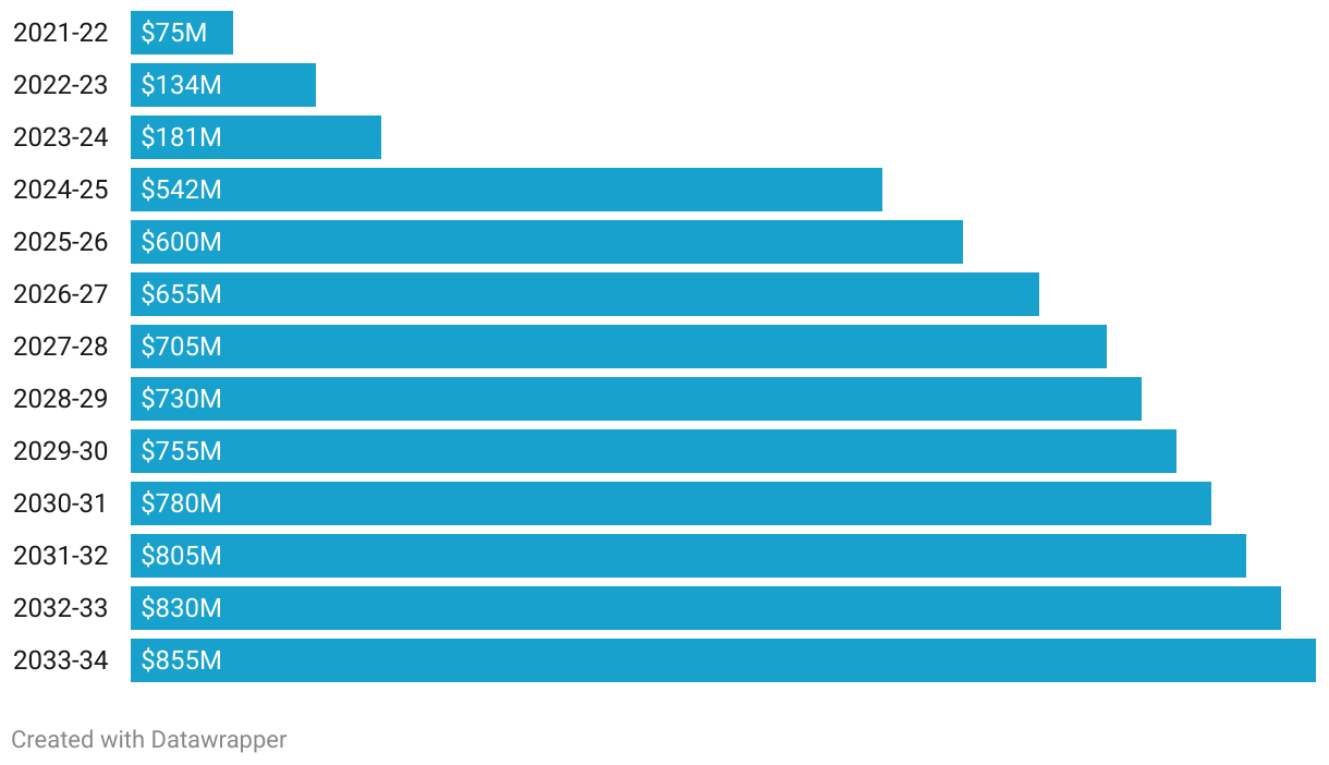 Here's the amount of state funding available for Opportunity Scholarship awards through Fall 2033. Recent state laws appropriated these funds in the base budget for future years, so lawmakers do not need to take any further action for these funds to be available.