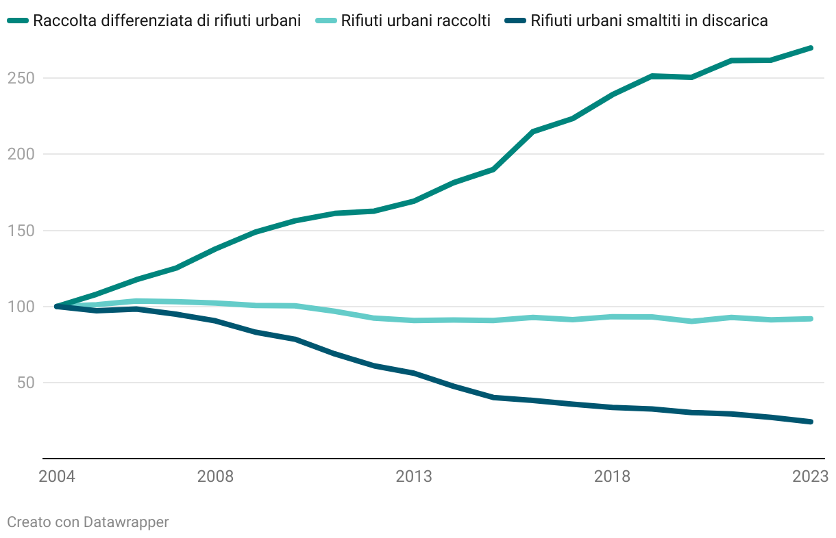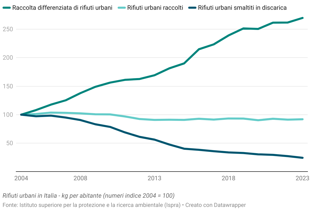 Rifiuti urbani in Italia - kg per abitante (numeri indice 2004 = 100)