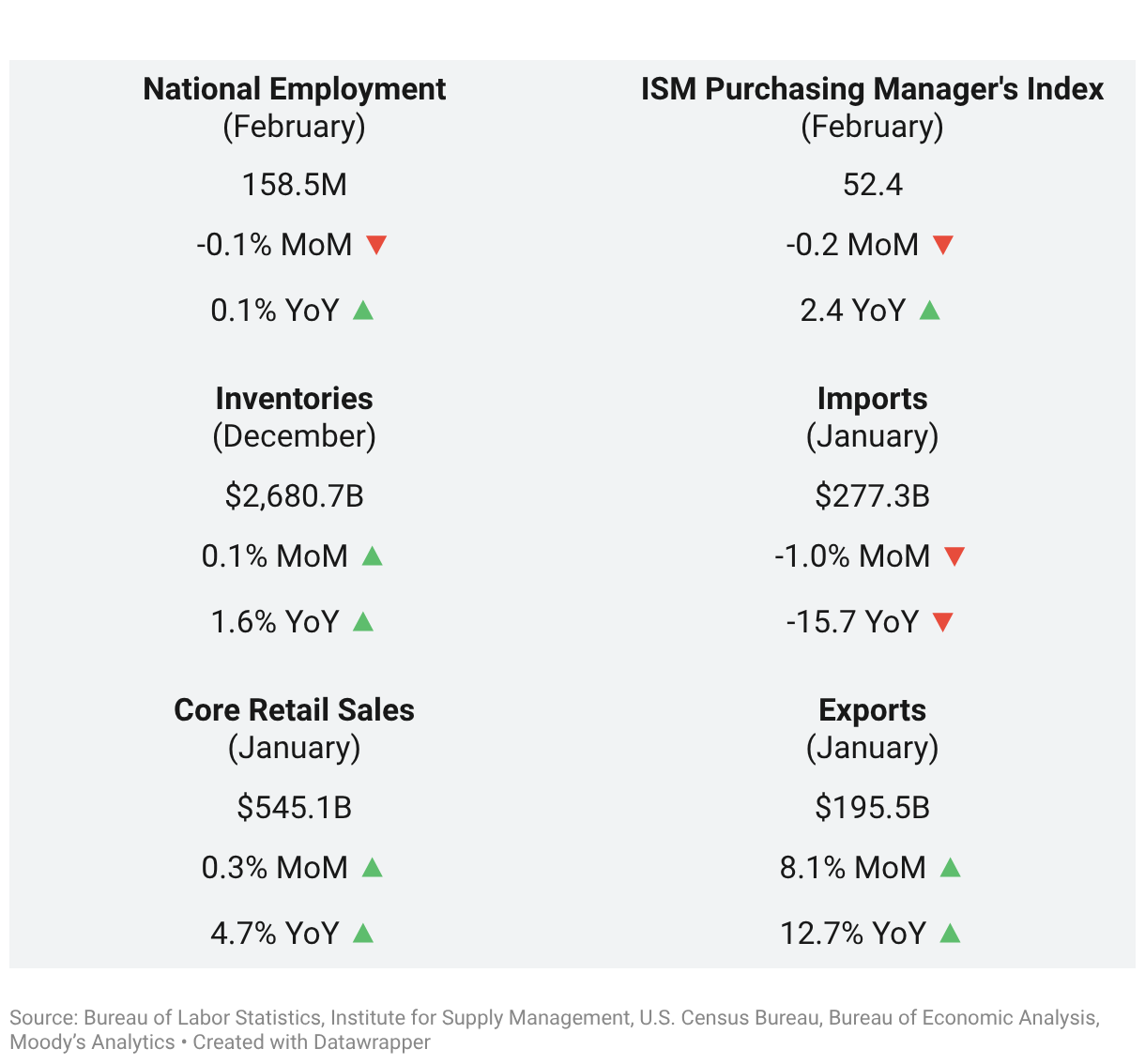 Source: Bureau of Labor Statistics, Institute for Supply Management, U.S. Census Bureau, Bureau of Economic Analysis, Moody’s AnalyticsEmbed Download imageCreated with Datawrapper