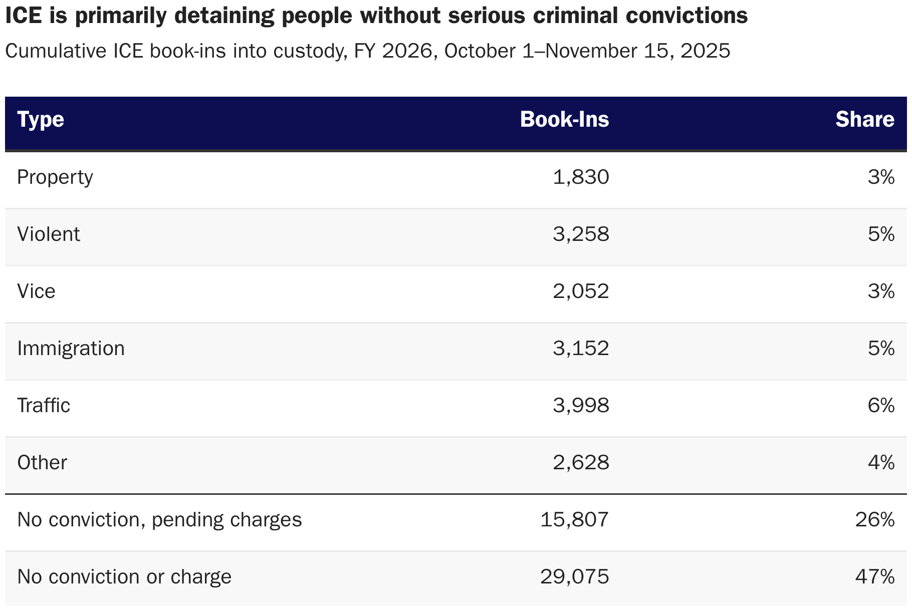 Cumulative ICE book-ins into custody, FY 2026, October 1–November 15, 2025
