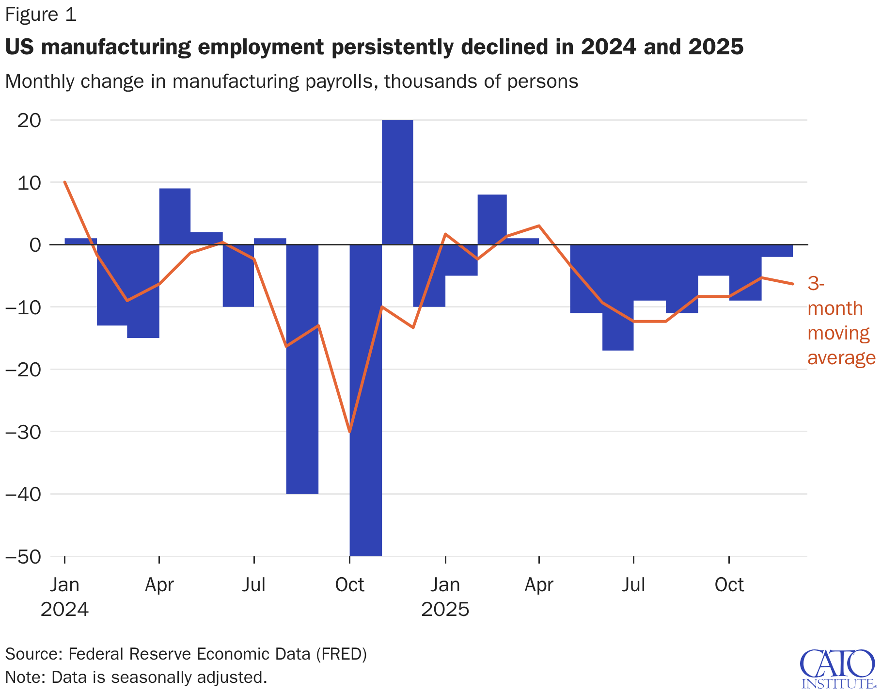 Monthly change in manufacturing payrolls, thousands of persons