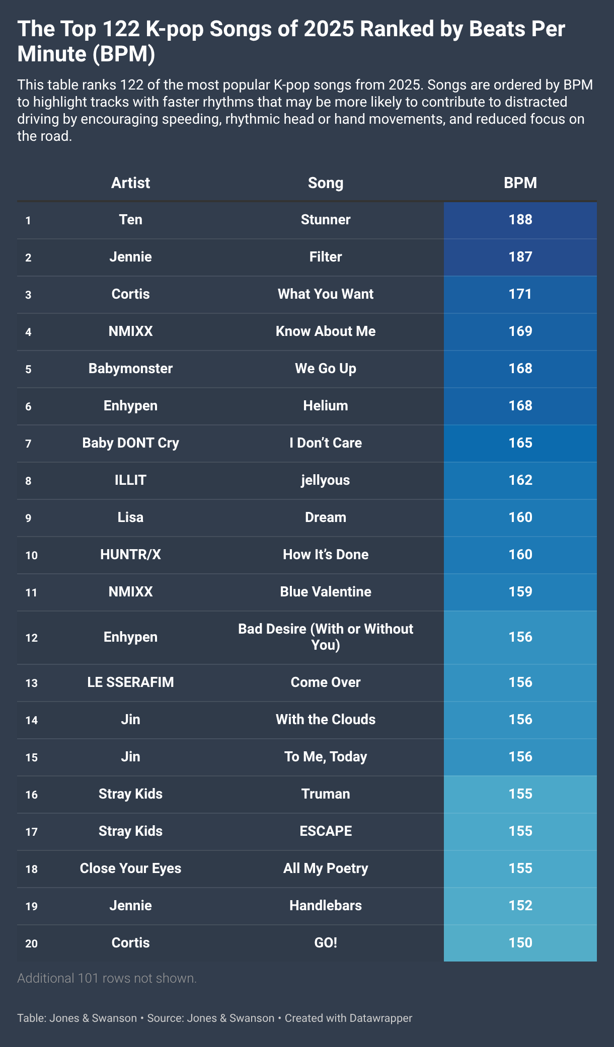 This table ranks 122 of the most popular K-pop songs from 2025. Songs are ordered by BPM to highlight tracks with faster rhythms that may be more likely to contribute to distracted driving by encouraging speeding, rhythmic head or hand movements, and reduced focus on the road.