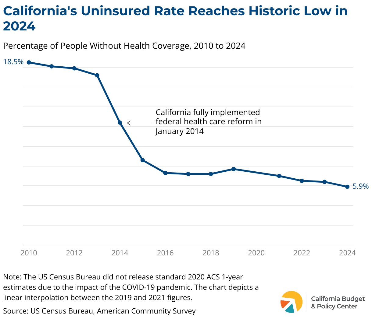 A trendline showing the percentage of people without health coverage between 2013 and 2023. The uninsured rate reached 6.4% in 2023, a steep decline since 2013, when the rate was above 17%.
