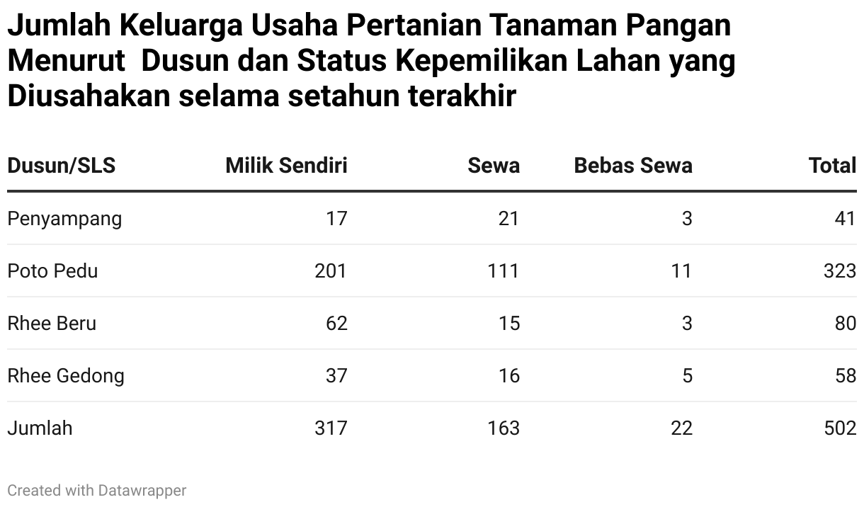 Jumlah Keluarga Usaha Pertanian Tanaman Pangan Menurut Dusun dan Status Kepemilikan Lahan yang Diusahakan selama setahun terakhir
