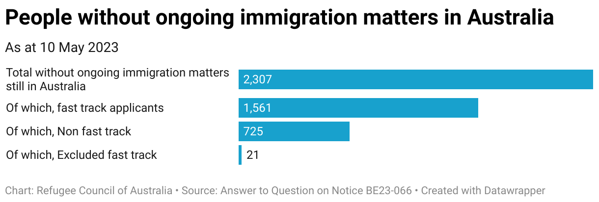 Bar chart showing 2,307 people without ongoing immigration matters in Australia, broken down by fast-track category