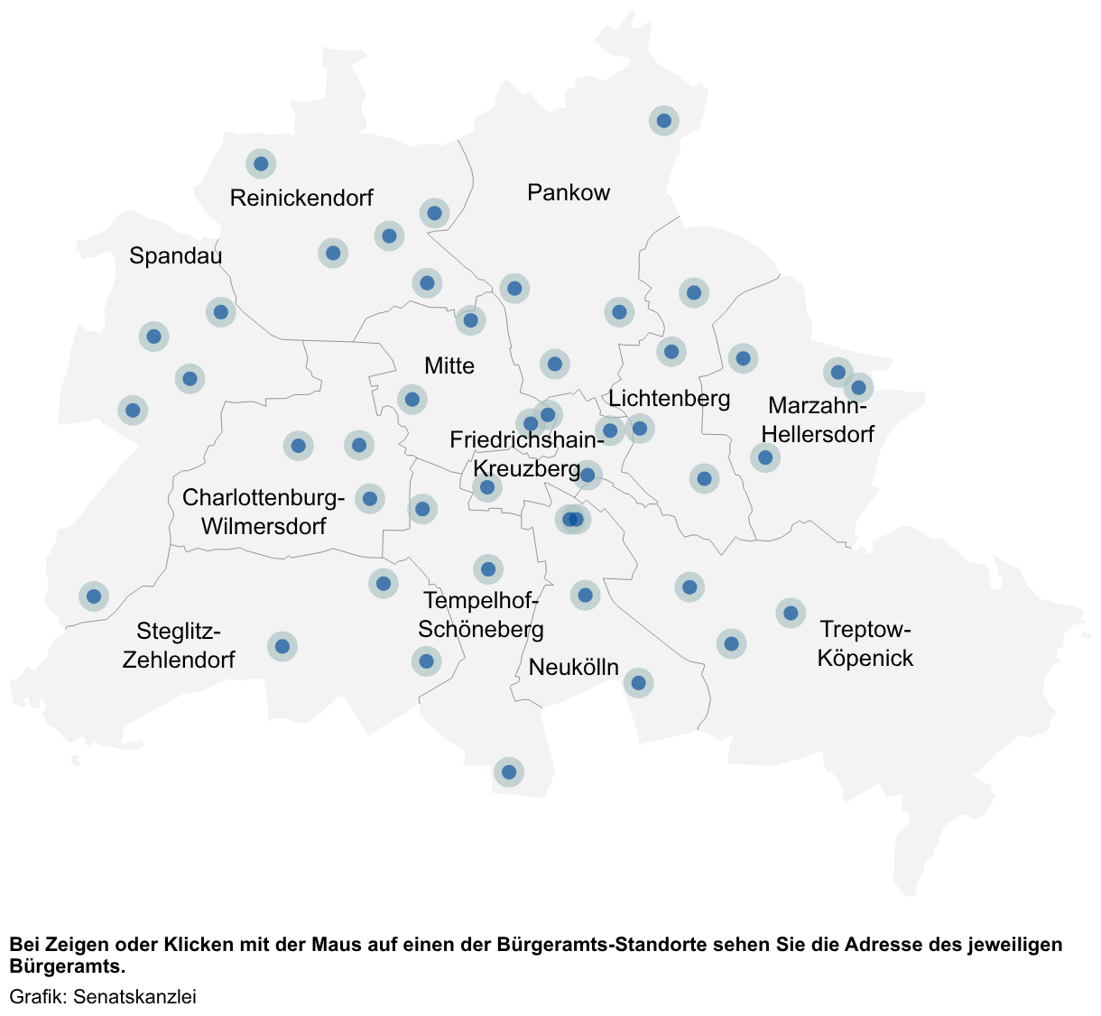 Bei Zeigen oder Klicken mit der Maus auf einen der Bürgeramts-Standorte sehen Sie die Adresse des jeweiligen Bürgeramts.