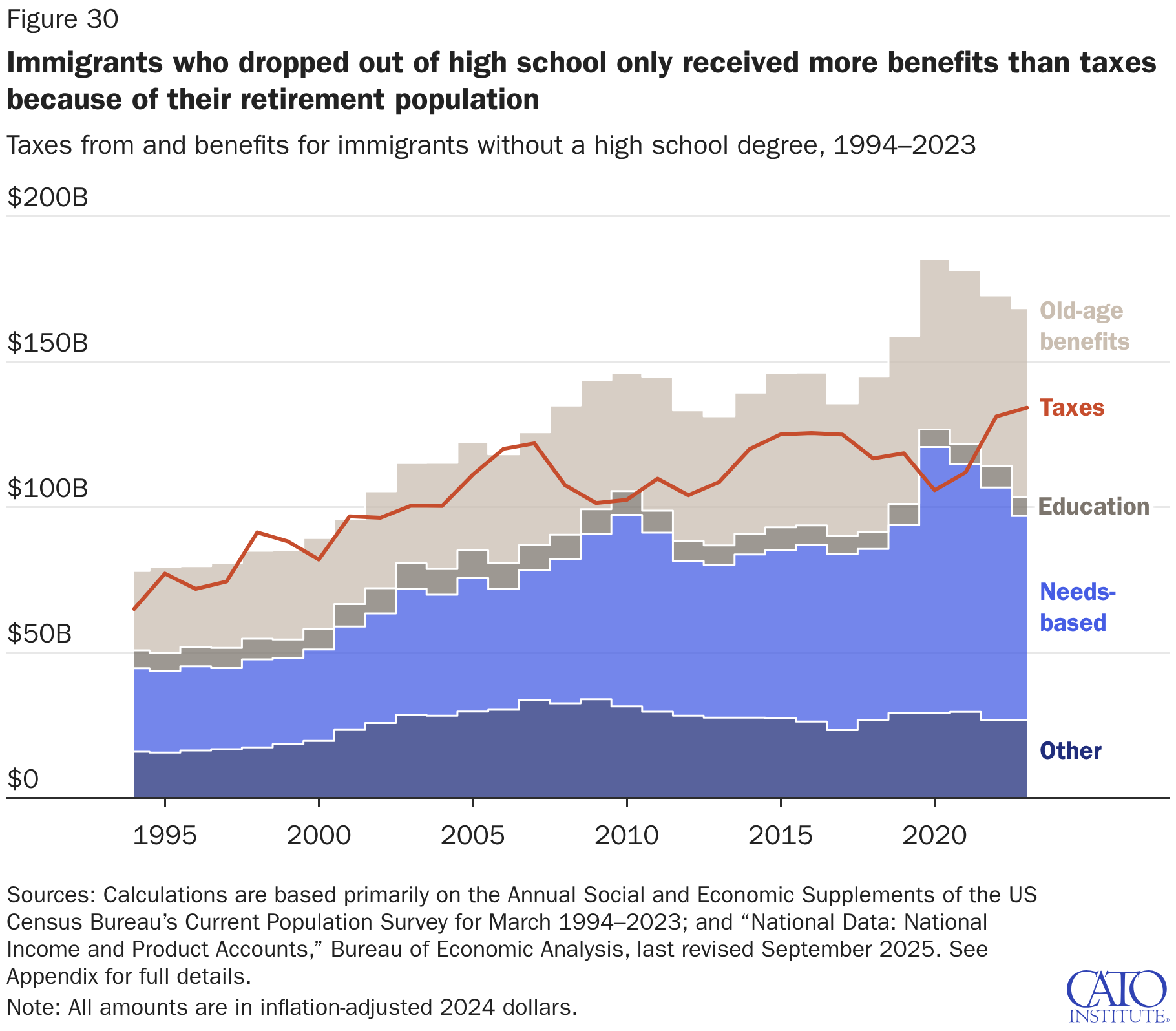 Taxes from and benefits for immigrants without a high school degree, 1994–2023