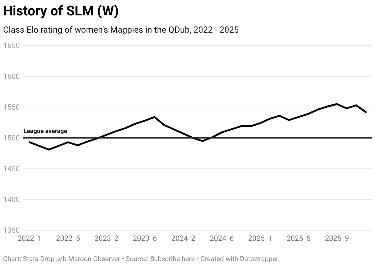 Class Elo rating of women's Magpies in the QDub, 2022 - 2025