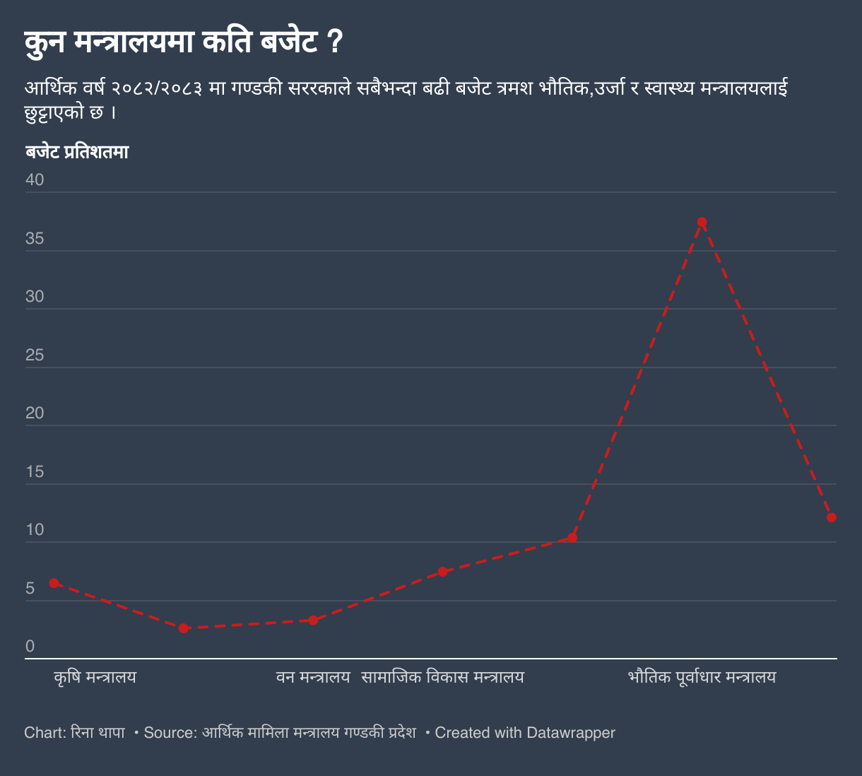आर्थिक वर्ष २०८२/२०८३ मा गण्डकी सररकाले सबैभन्दा बढी बजेट त्रमश भाैतिक,उर्जा र स्वास्थ्य मन्त्रालयलाई छुट्टाएकाे छ ।