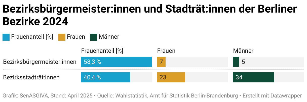 Bei den Bezirksstadträtinnen und Bezirksstadträten überwog 2024 die Zahl der Männer mit 34 zu 23 Frauen. Bürgermeister gab es mit 5 etwas weniger als Bürgermeisterinnen (7).