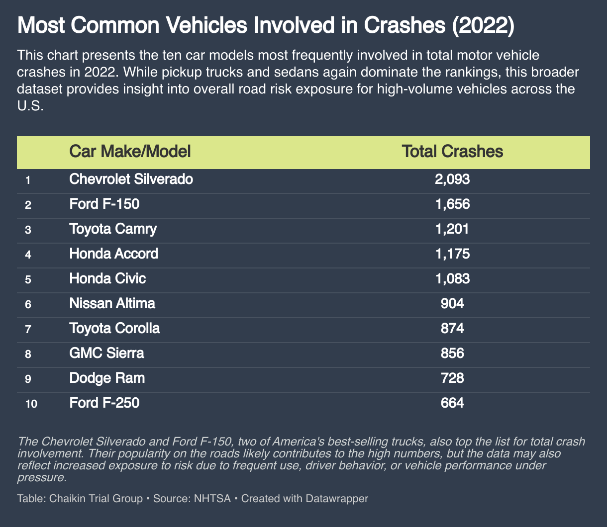 This chart presents the ten car models most frequently involved in total motor vehicle crashes in 2022. While pickup trucks and sedans again dominate the rankings, this broader dataset provides insight into overall road risk exposure for high-volume vehicles across the U.S.