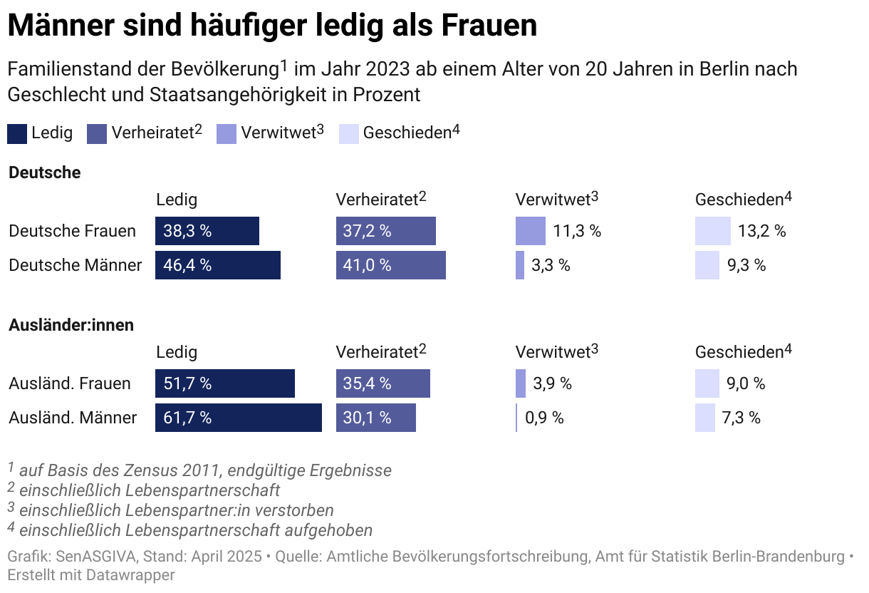 Generell sind Männer häufiger ledig als Frauen. Am höchsten ist der Anteil der Ledigen unter den Männern ohne deutsche Staatsangehörigkeit mit 60 Prozent.