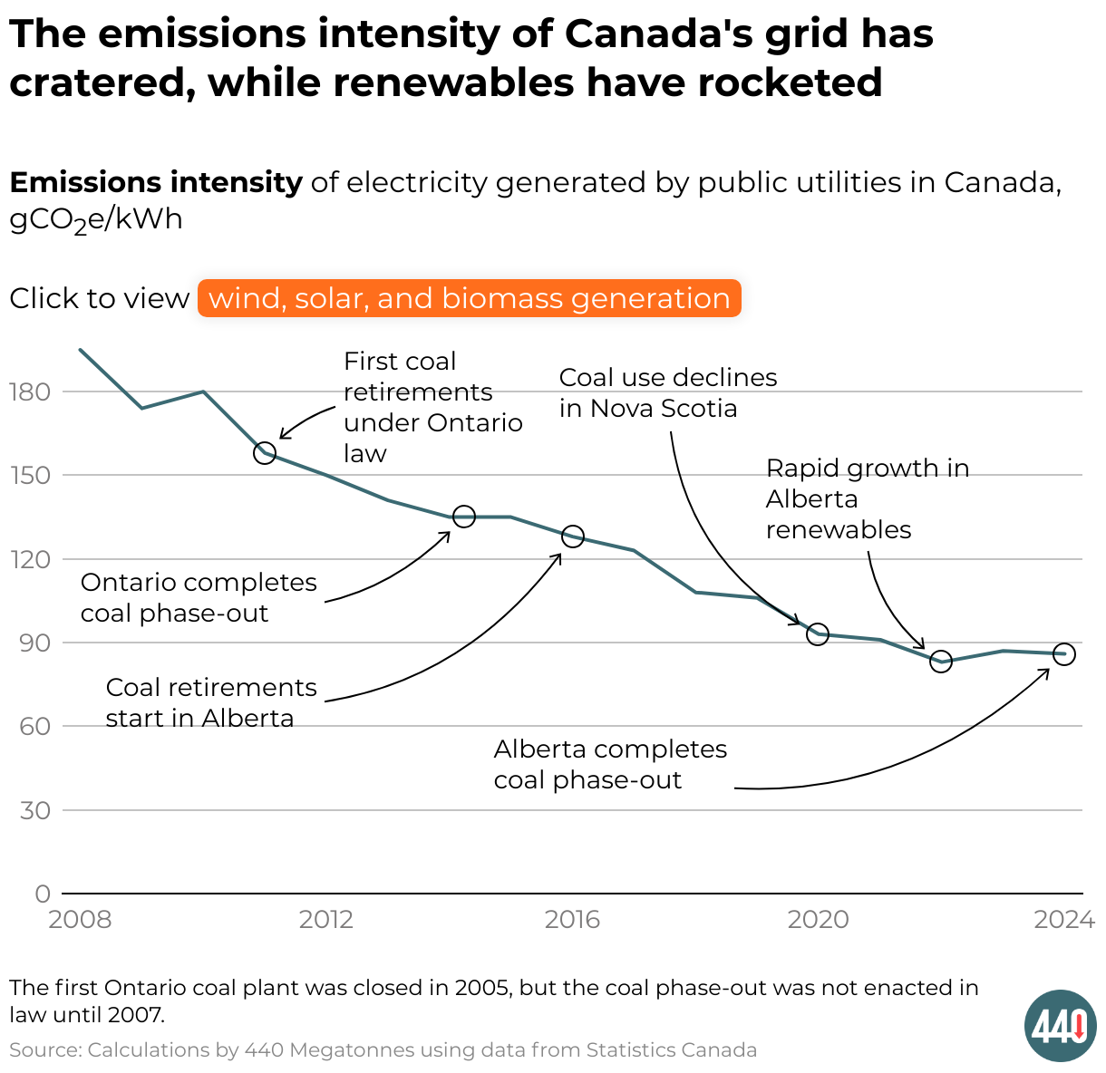 Emissions intensity of electricity generated by public utilities in Canada, gCO2e/kWh Click to view wind, solar, and biomass generation