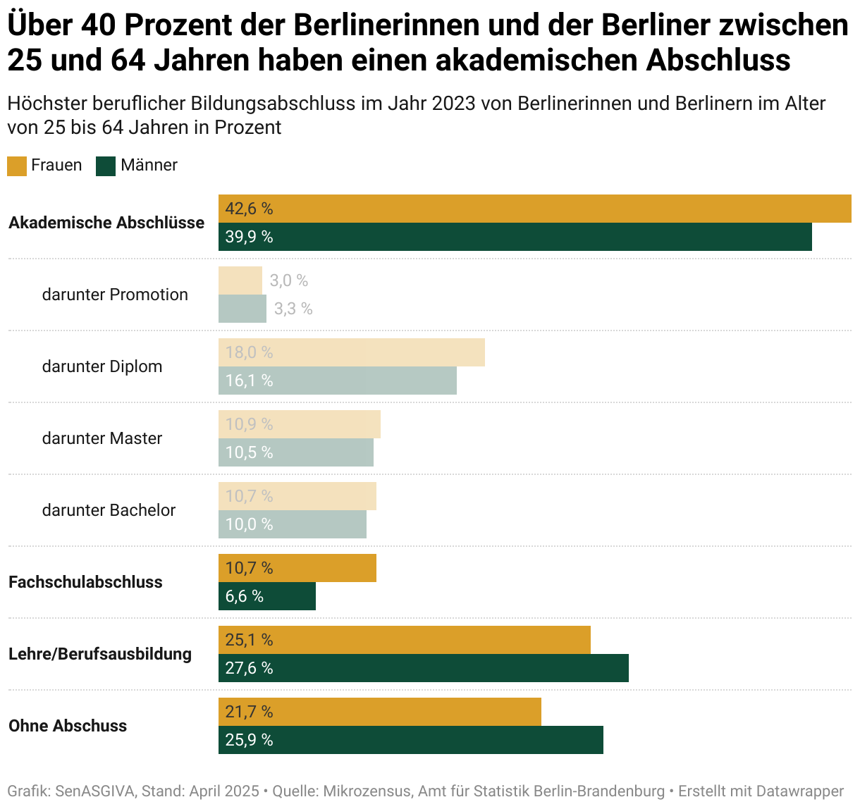 Die Berlinerinnen im Alter von 25 bis 64 Jahren haben etwas häufiger einen akademischen Abschluss als die Berliner (Frauen: 42,6 Prozent, Männer: 39,9 Prozent). Beim höchsten akademischen Abschluss, der Promotion, liegen die Männer mit 3,3 Prozent vor den Frauen (3,0 Prozent).