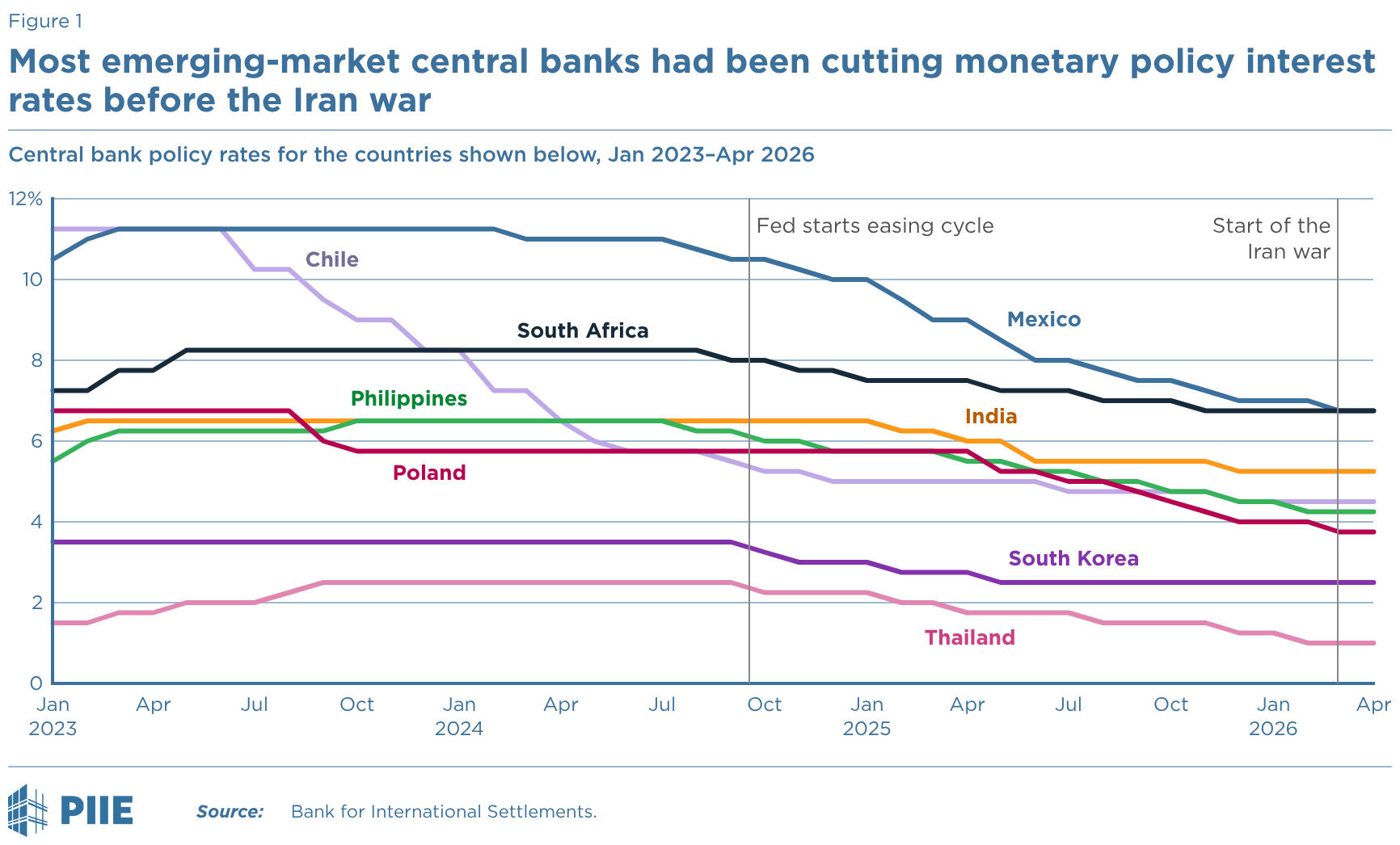 Central bank policy rates for the countries shown below, Jan 2023–Apr 2026