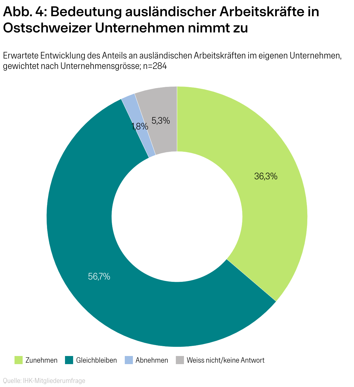 Erwartete Entwicklung des Anteils an ausländischen Arbeitskräften im eigenen Unternehmen, gewichtet nach Unternehmensgrösse; n=284