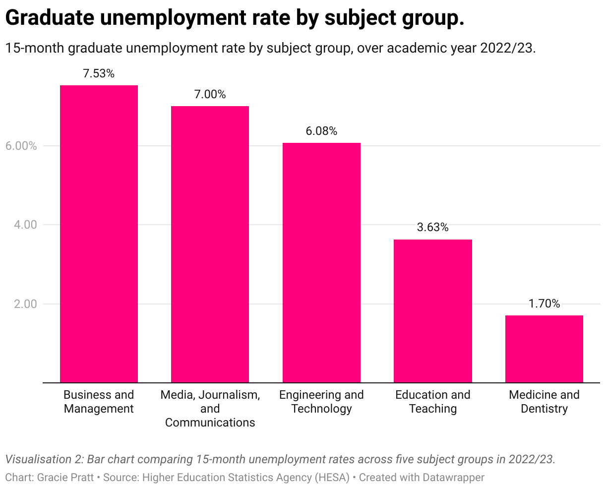 15-month graduate unemployment rate by subject group, over academic year 2022/23.