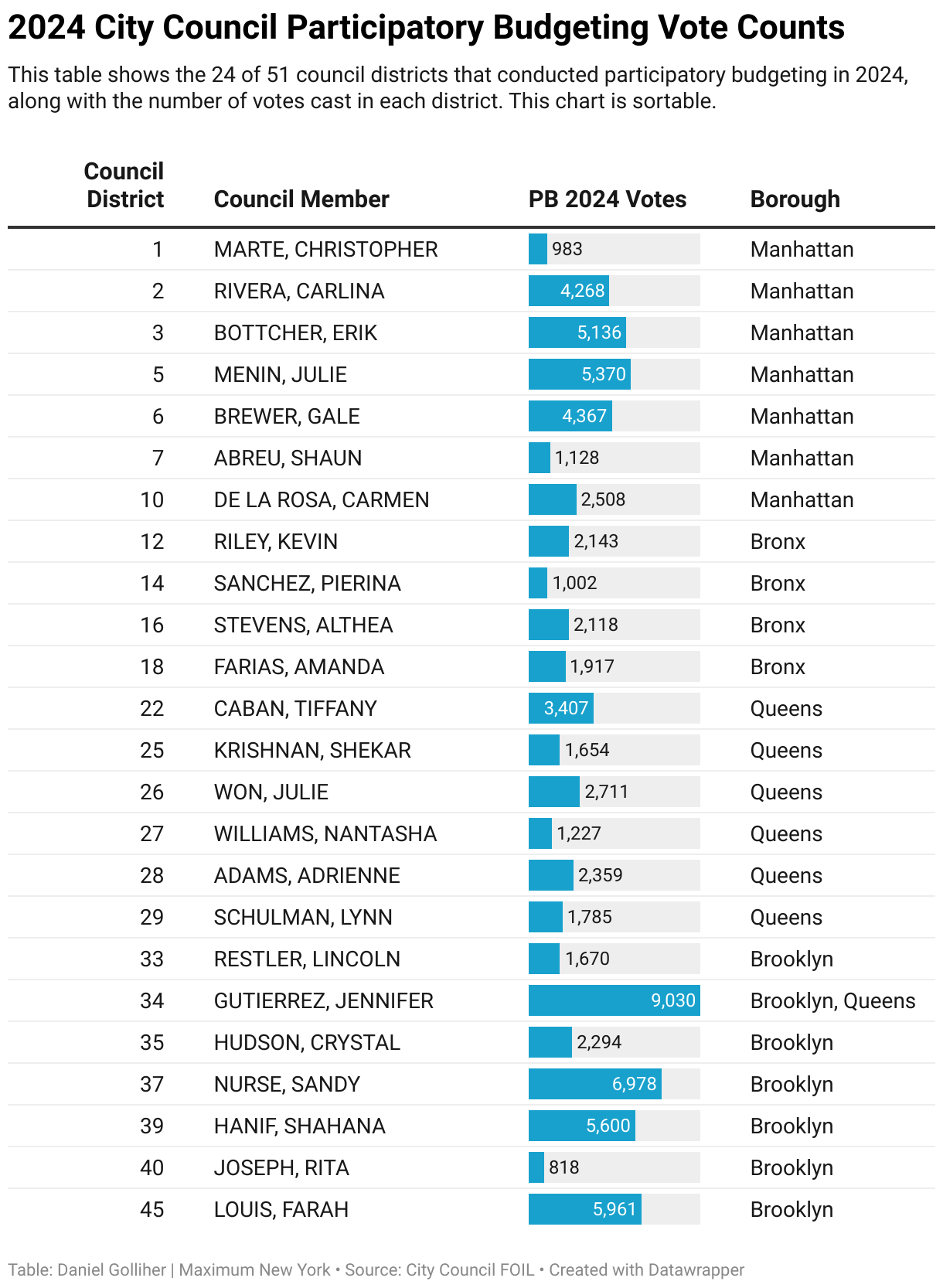 This table shows the 24 of 51 council districts that conducted participatory budgeting in 2024, along with the number of votes cast in each district. This chart is sortable.