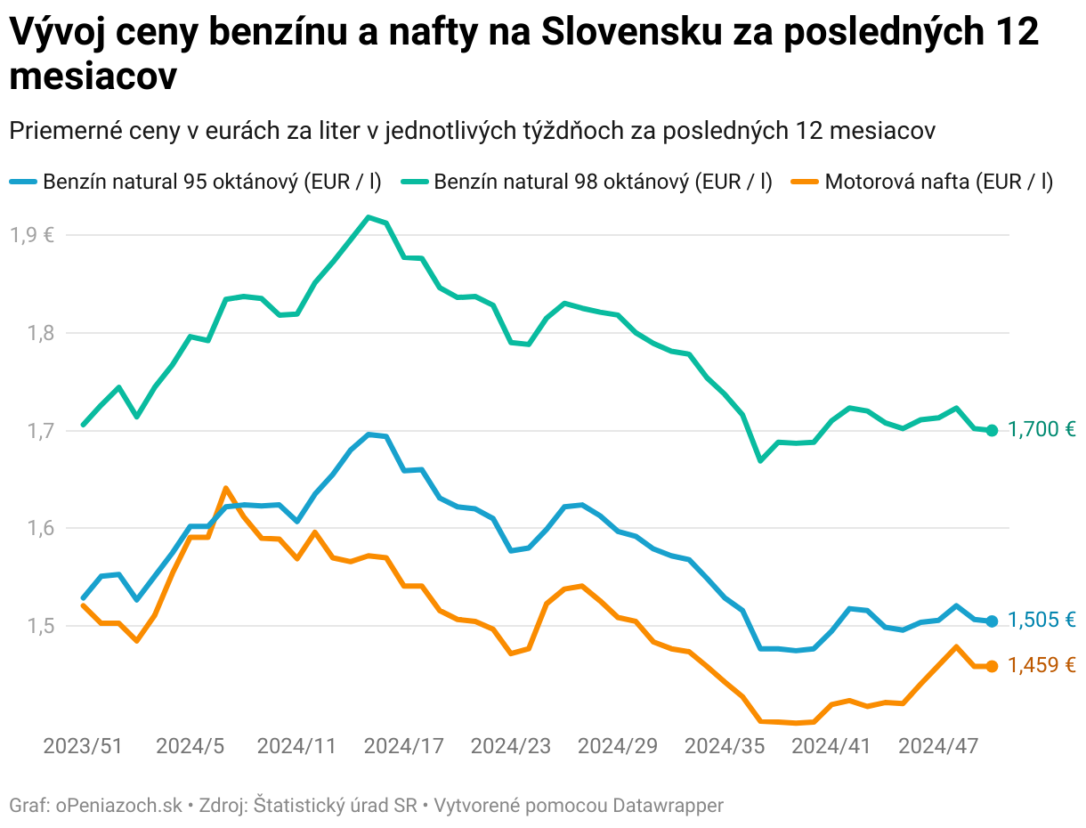 Vývoj ceny benzínu a nafty na Slovensku za posledných 12 mesiacov