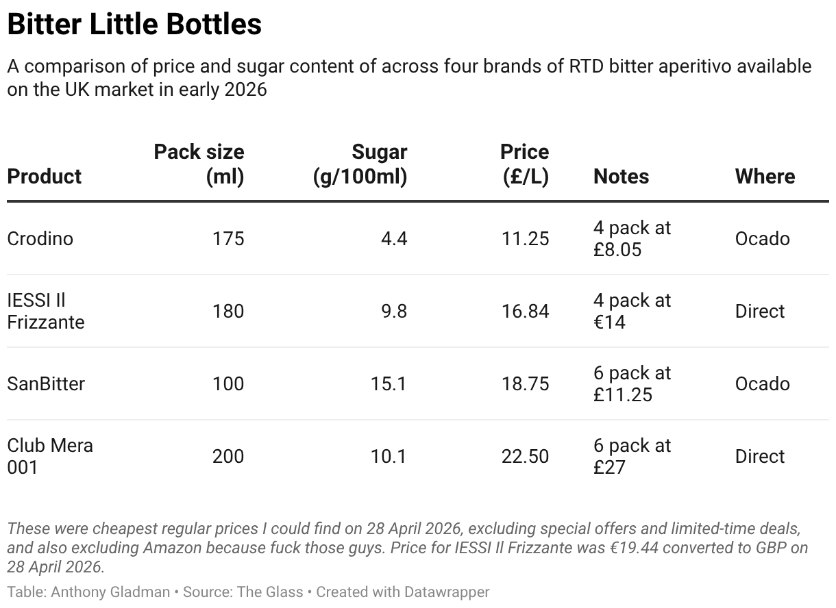 A comparison of price and sugar content of across four brands of RTD bitter aperitivo available on the UK market in early 2026
