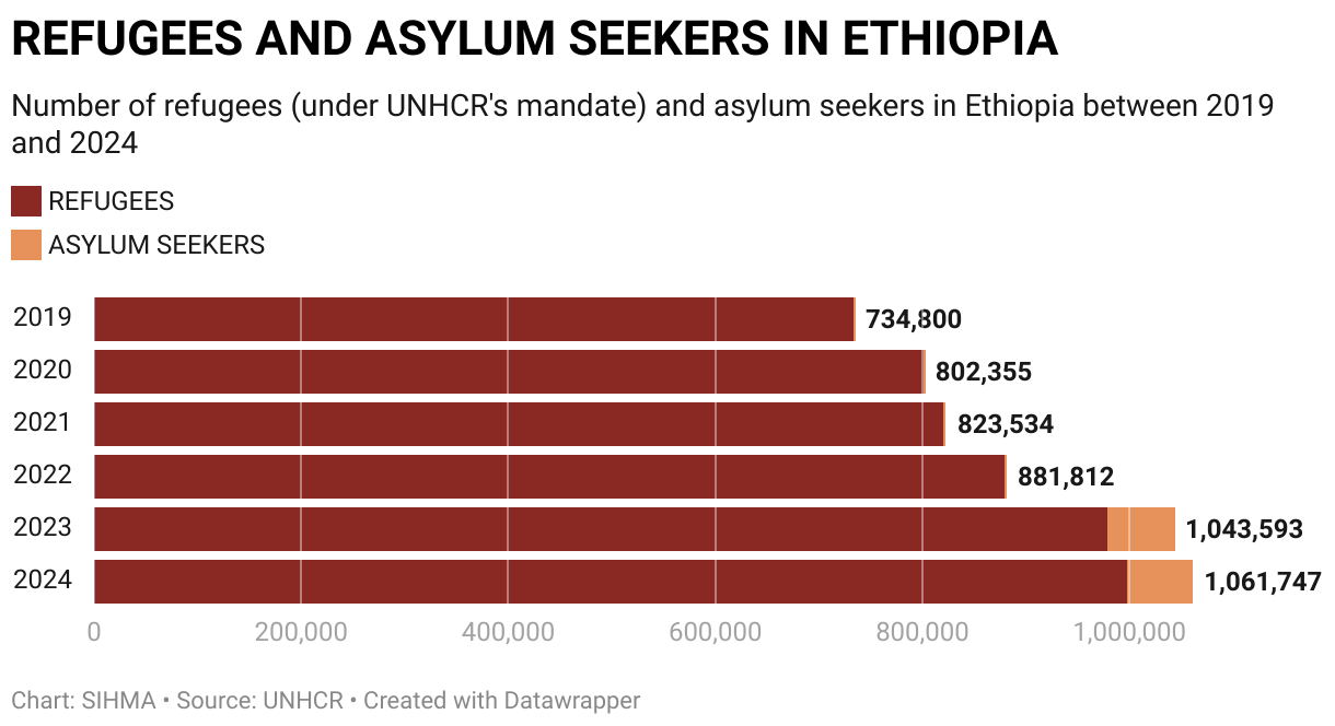 Number of refugees (under UNHCR's mandate) and asylum seekers in Ethiopia between 2019 and 2024