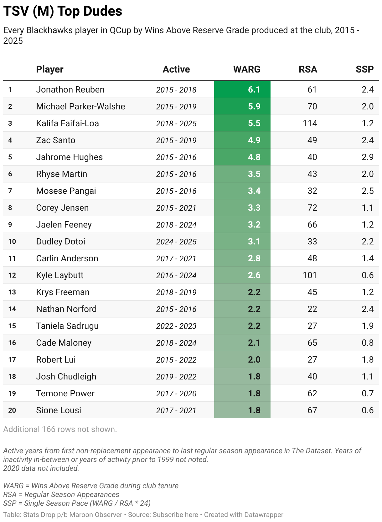 Every Blackhawks player in QCup by Wins Above Reserve Grade produced at the club, 2015 - 2025