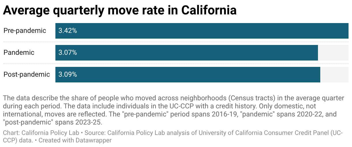 A horizontal bar chart showing the percentage of Californians who moved across neighborhoods in an average quarter. The rate was 3.42% pre-pandemic, dropped to 3.07% during the pandemic, and remains lower at 3.09% post-pandemic. This indicates an overall decline in residential mobility within the state.
