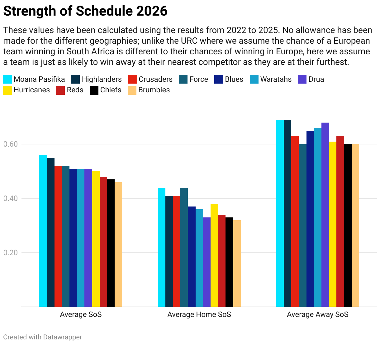 These values have been calculated using the results from 2022 to 2025. No allowance has been made for the different geographies; unlike the URC where we assume the chance of a European team winning in South Africa is different to their chances of winning in Europe, here we assume a team is just as likely to win away at their nearest competitor as they are at their furthest.