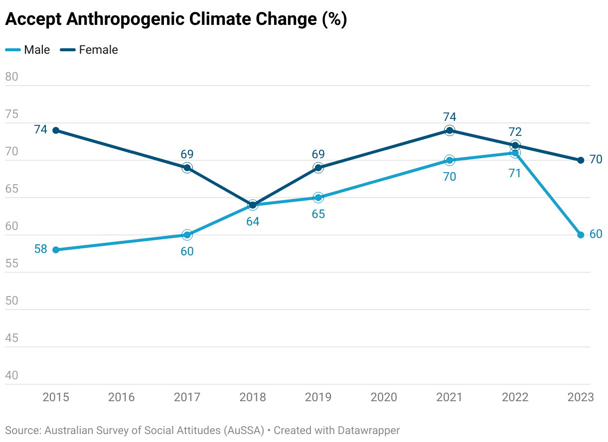 Percentage that agree that climate change is occurring by respondent sex, 2015 to 2023