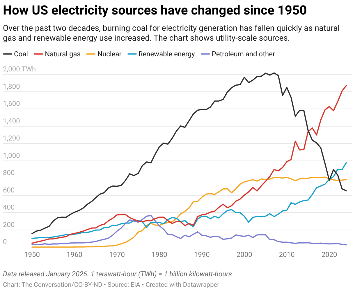 Over the past two decades, burning coal for electricity generation has fallen quickly as natural gas and renewable energy use increased. The chart shows utility-scale sources.