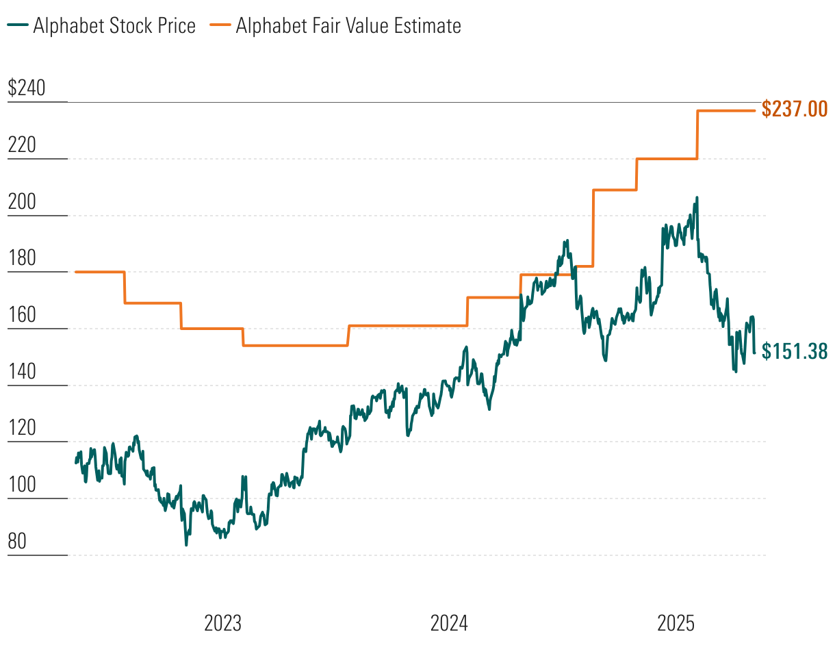 Line chart showing price vs. Morningstar Fair Value Estimate for Alphabet.