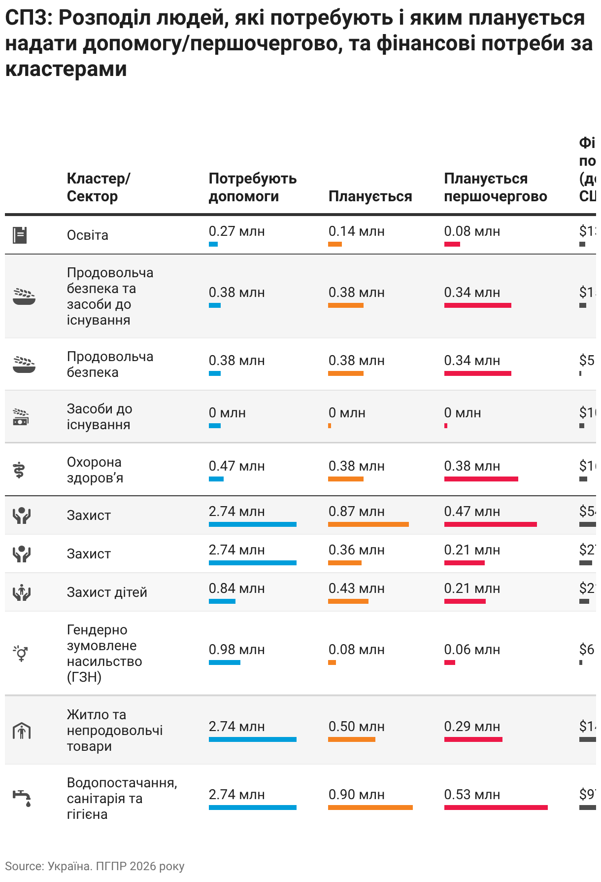 МП3: Розподіл людей, які потребують і яким планується надати допомогу/першочергово, та фінансові потреби за кластерами