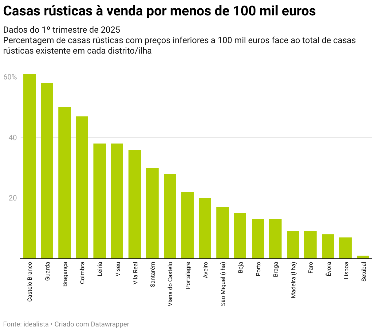 Dados do 1º trimestre de 2025 Percentagem de casas rústicas com preços inferiores a 100 mil euros face ao total de casas rústicas existente em cada distrito/ilha