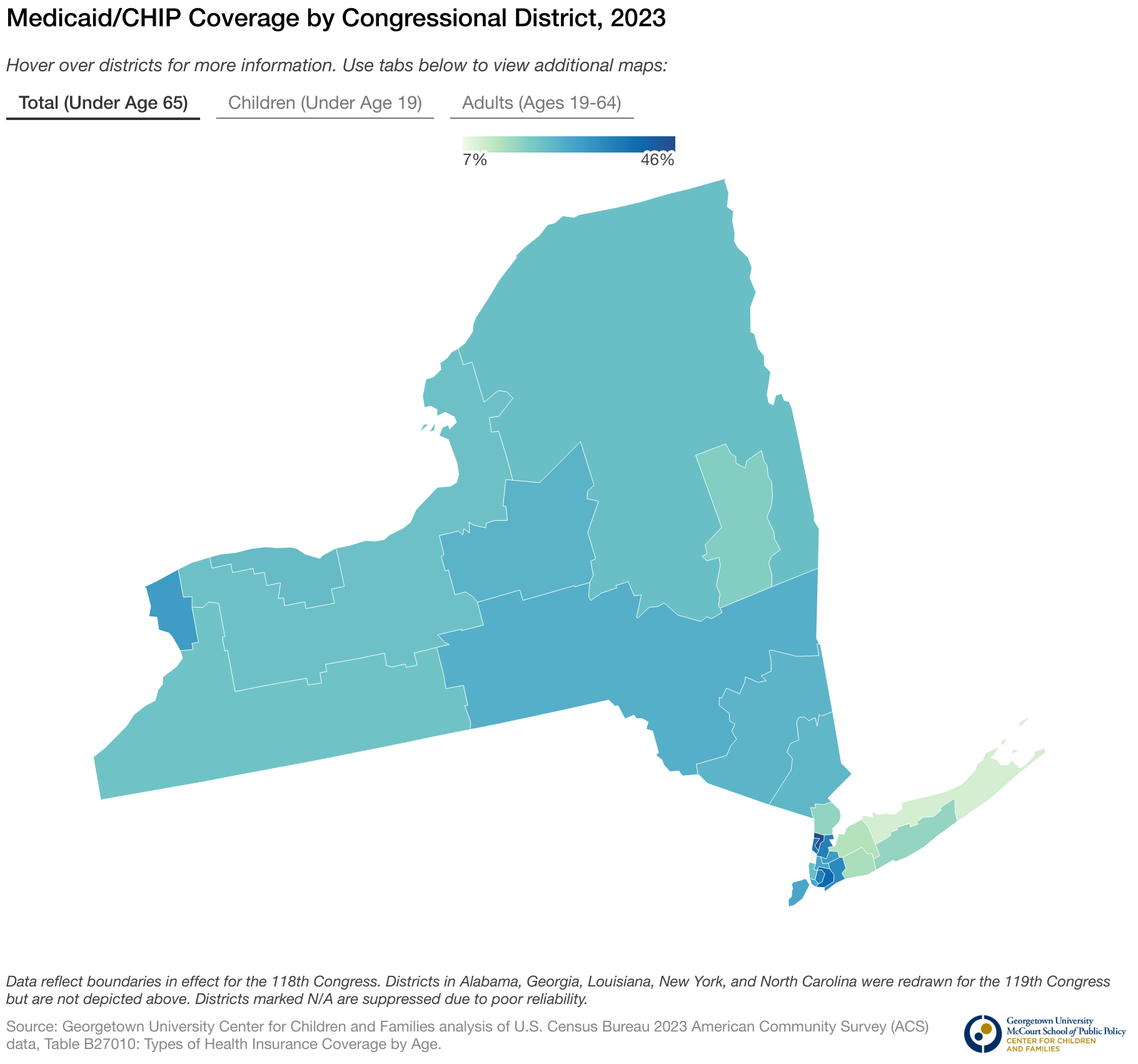 Hover over districts for more information. Use tabs below to view additional maps: Total (Under Age 65) Children (Under Age 19) Adults (Ages 19-64)