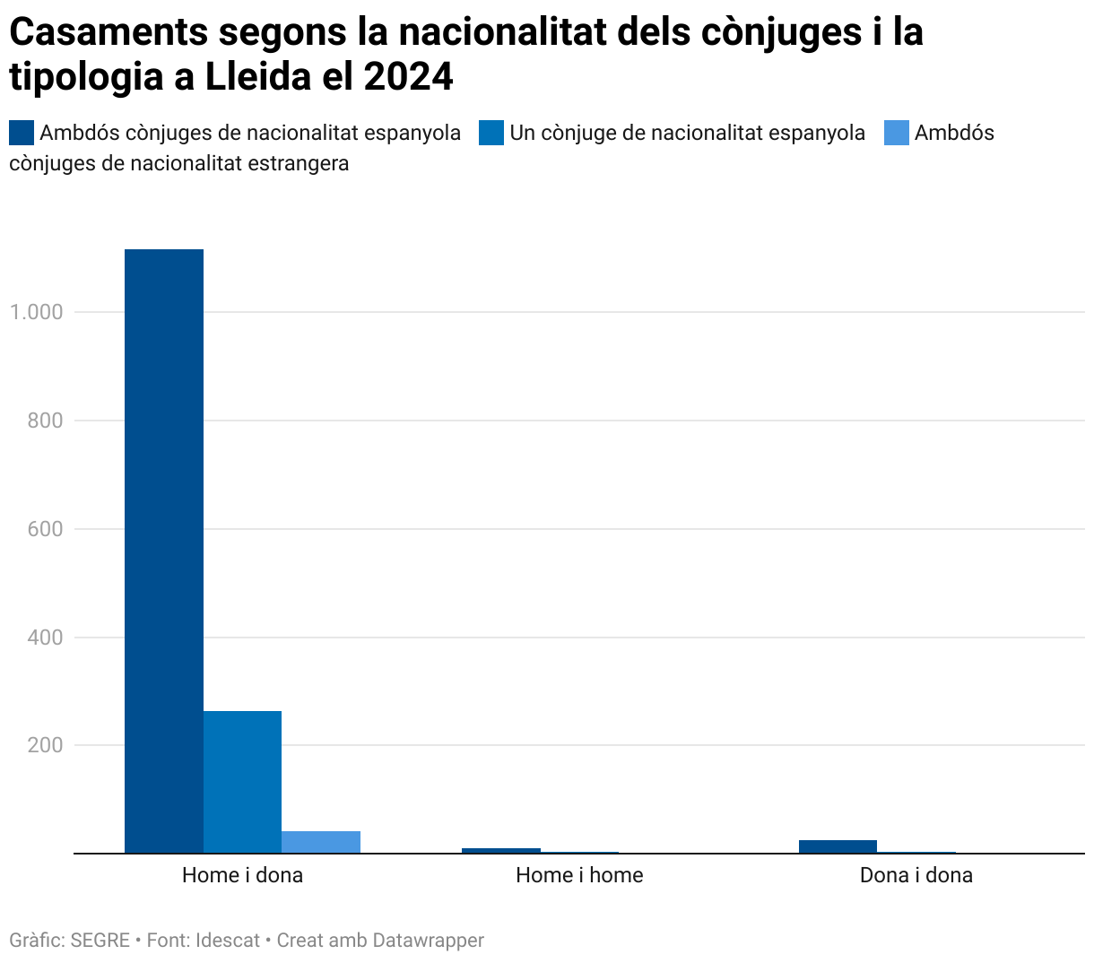Casaments segons la nacionalitat dels cònjuges i la tipologia a Lleida el 2024