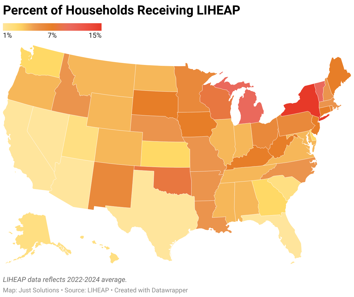 Map of percent of households, by state, receiving LIHEAP assistance ranges from 1% in California and Texas to 15% in New York.