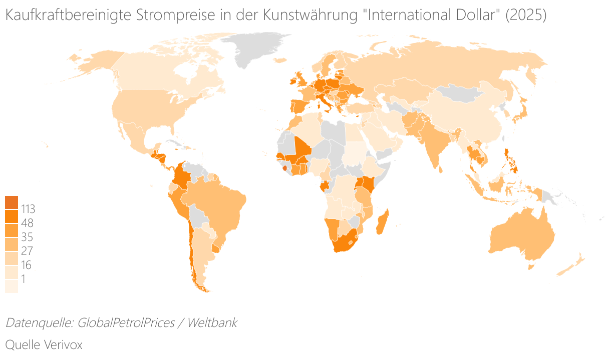 Kaufkraftbereinigte Strompreise in der Kunstwährung "International Dollar" (2025)
