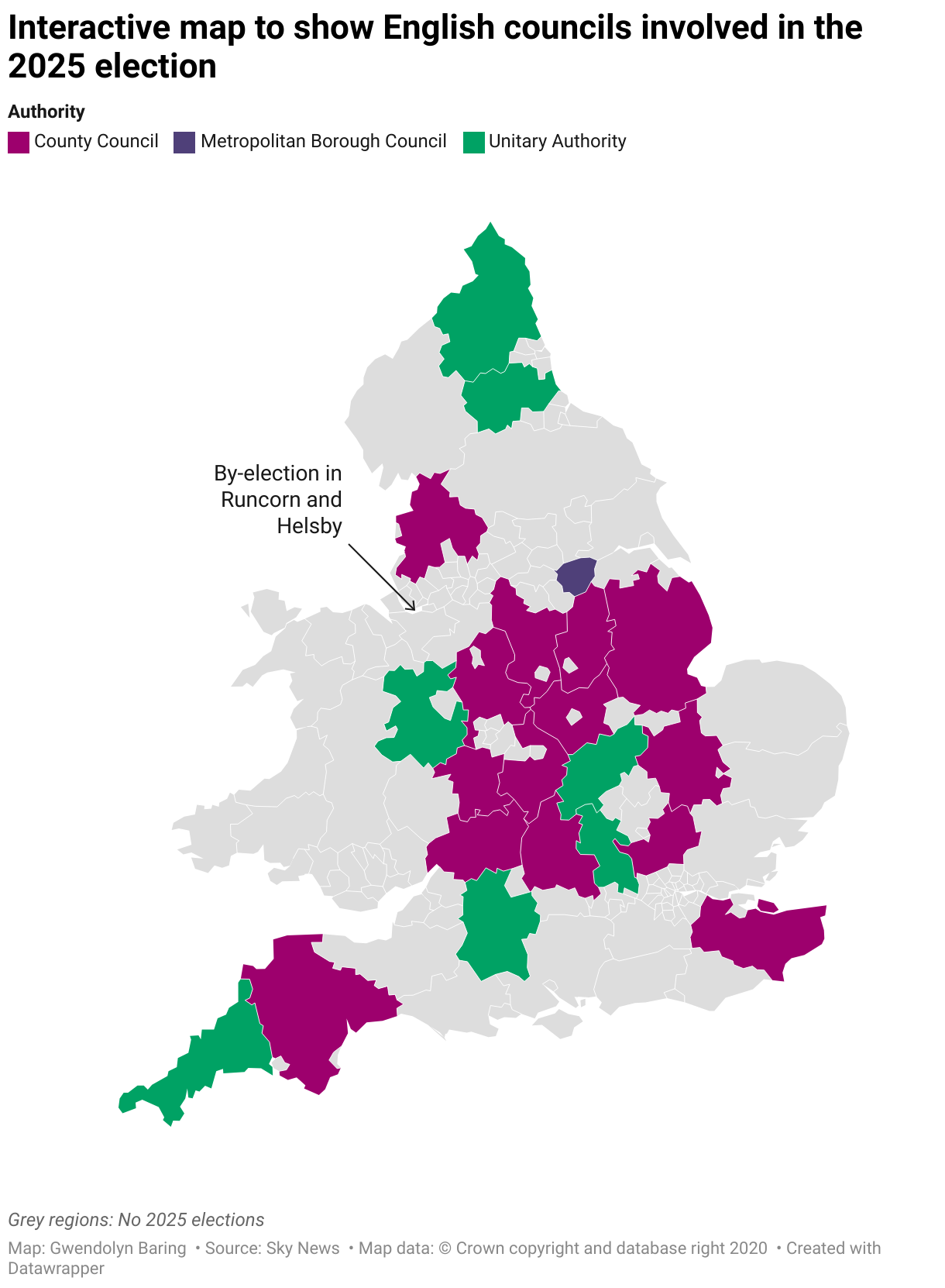 Interactive map highlighting local councils in England participating in the 2025 local elections. Each council region is outlines and clickable, allowing readers to discover election details by region. Text-based list of map is available above the map.