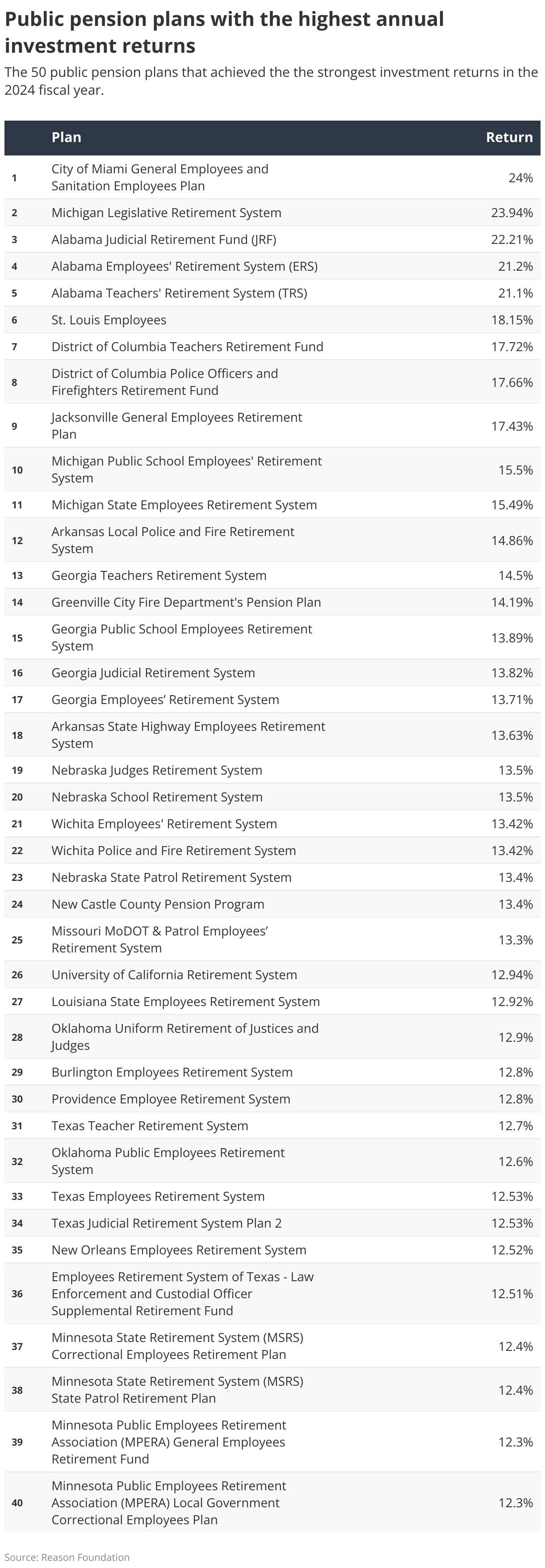 The 50 public pension plans that achieved the the strongest investment returns in the 2024 fiscal year.