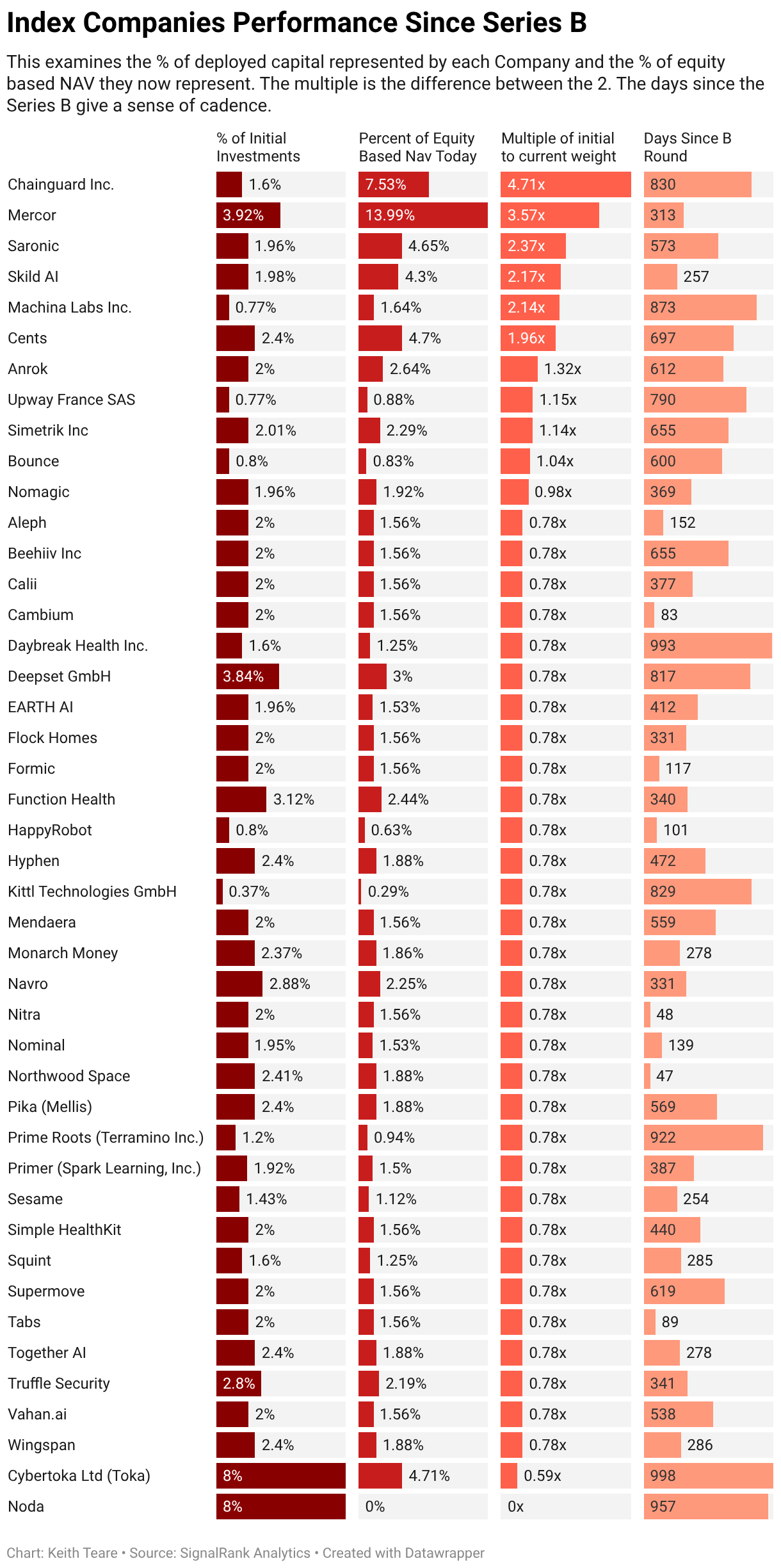 This examines the % of deployed capital represented by each Company and the % of equity based NAV they now represent. The multiple is the difference between the 2. The days since the Series B give a sense of cadence.
