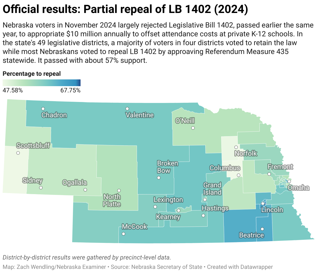 Nebraska voters in November 2024 largely rejected Legislative Bill 1402, passed earlier the same year, to appropriate $10 million annually to offset attendance costs at private K-12 schools. In the state's 49 legislative districts, a majority of voters in four districts voted to retain the law while most Nebraskans voted to repeal LB 1402 by approaving Referendum Measure 435 statewide. It passed with about 57% support.