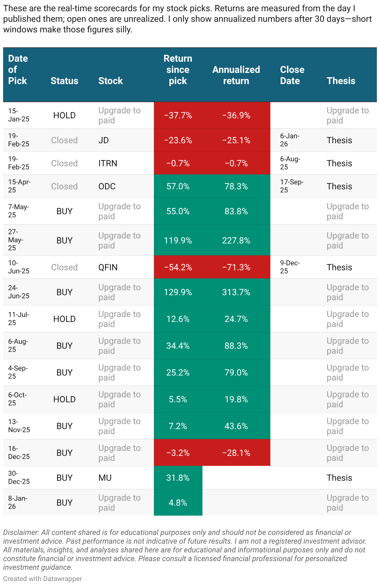 These are the real-time scorecards for my stock picks. Returns are measured from the day I published them; open ones are unrealized. I only show annualized numbers after 30 days—short windows make those figures silly.
