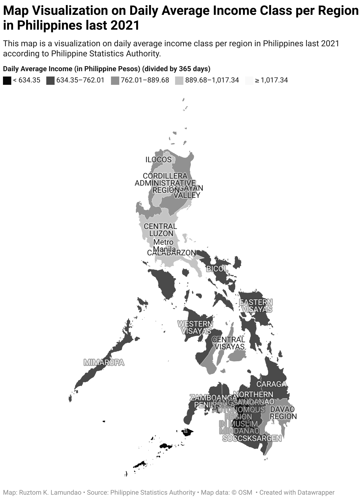 This map is a visualization on daily average income class per region in Philippines last 2021 according to Philippine Statistics Authority.