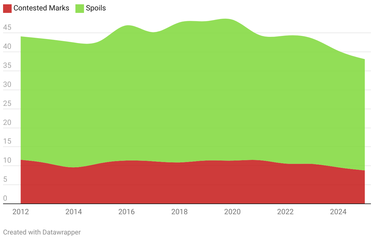 Spoils are also at a low mark since 2012.