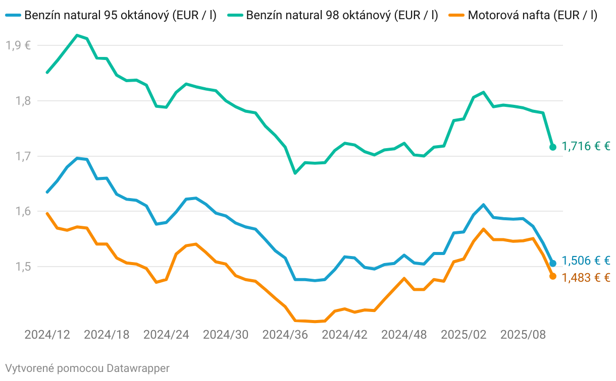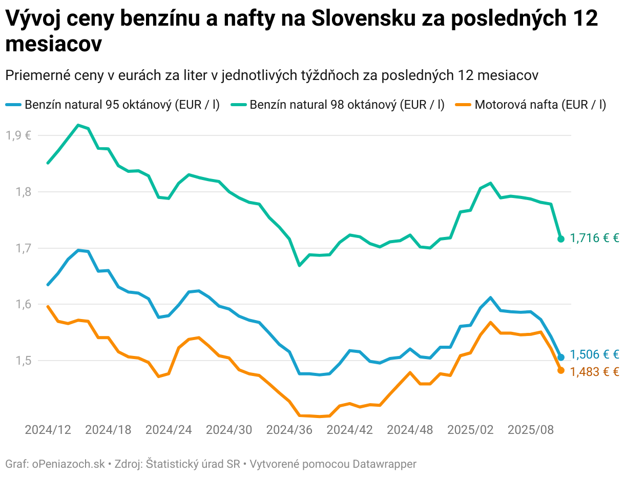 Vývoj ceny benzínu a nafty na Slovensku za posledných 12 mesiacov