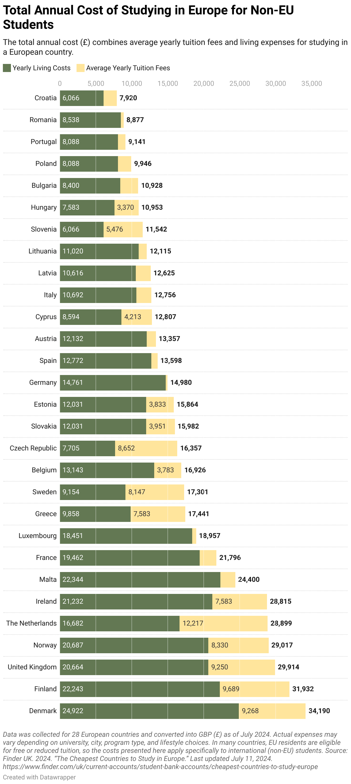 The total annual cost (£) combines average yearly tuition fees and living expenses for studying in a European country.