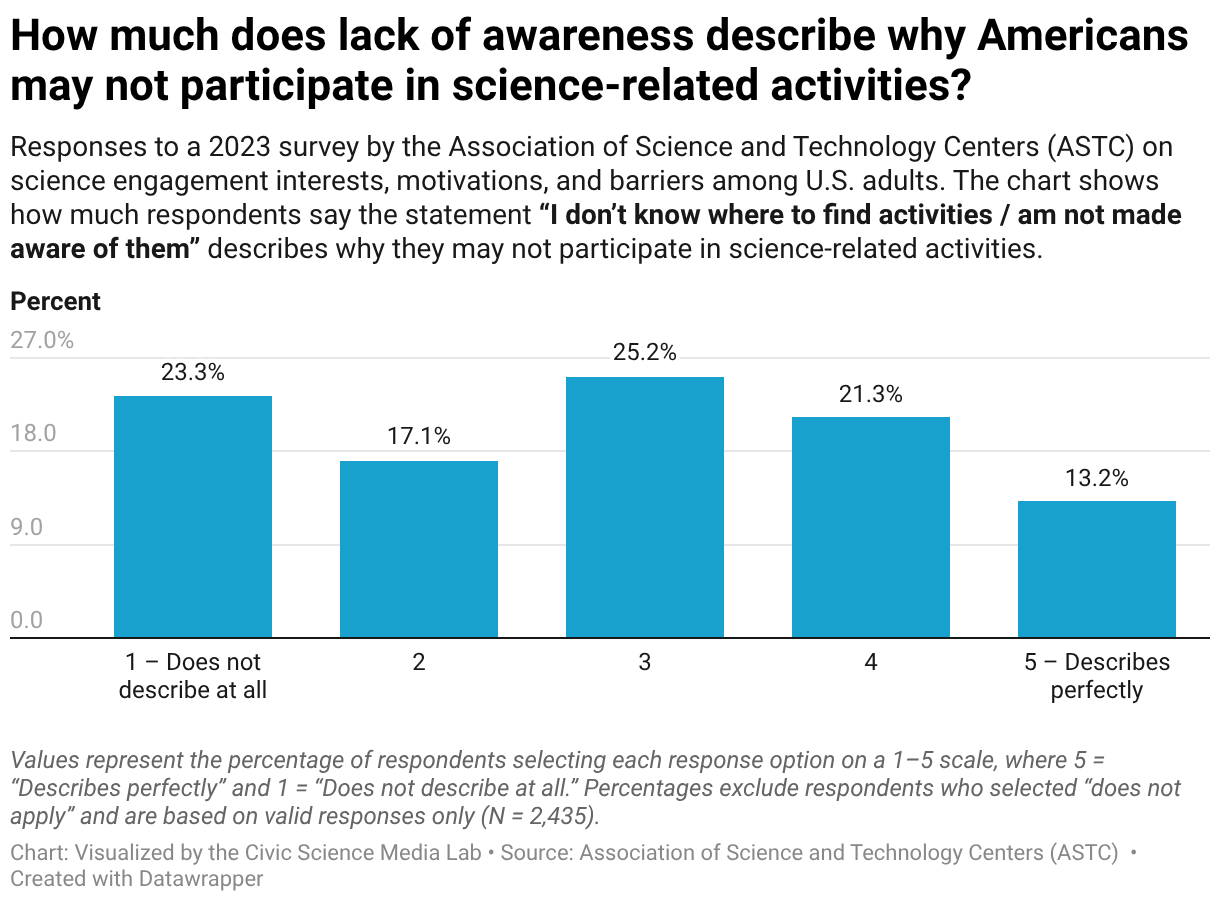Responses to a 2023 survey by the Association of Science and Technology Centers (ASTC) on science engagement interests, motivations, and barriers among U.S. adults. The chart shows how much respondents say the statement “I don’t know where to find activities / am not made aware of them” describes why they may not participate in science-related activities.