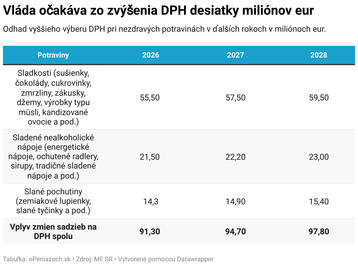Odhad vyššieho výberu DPH pri nezdravých potravinách v ďalších rokoch v miliónoch eur.